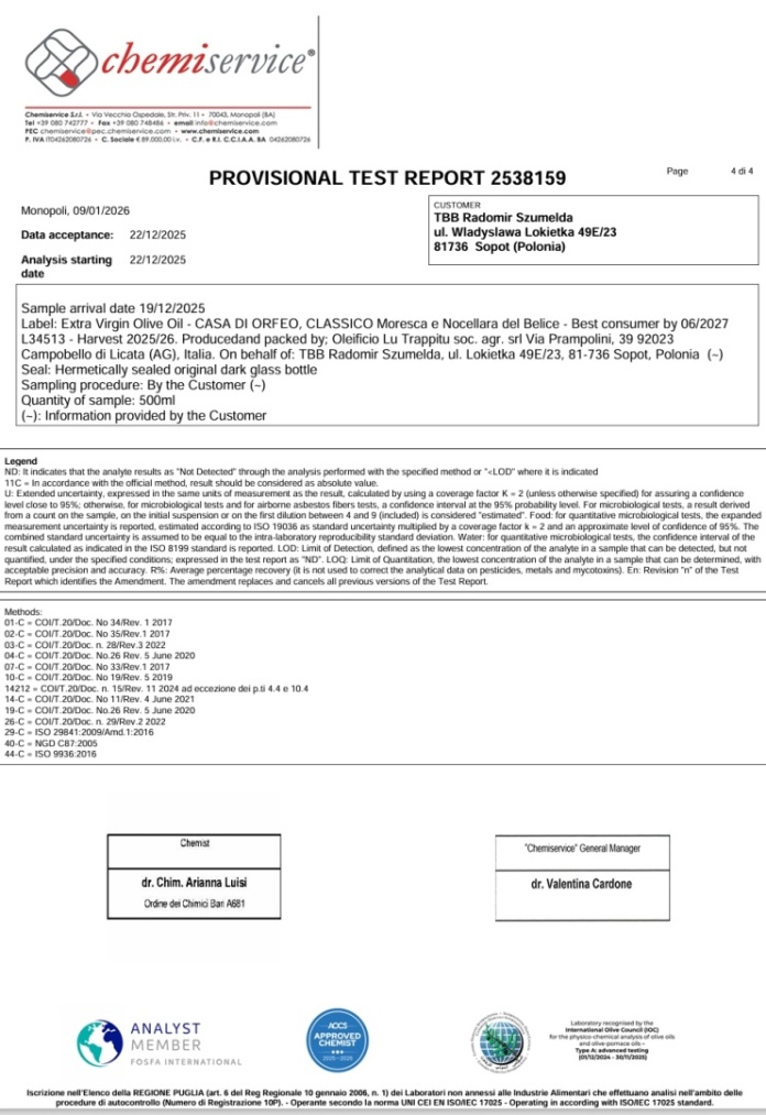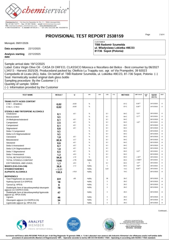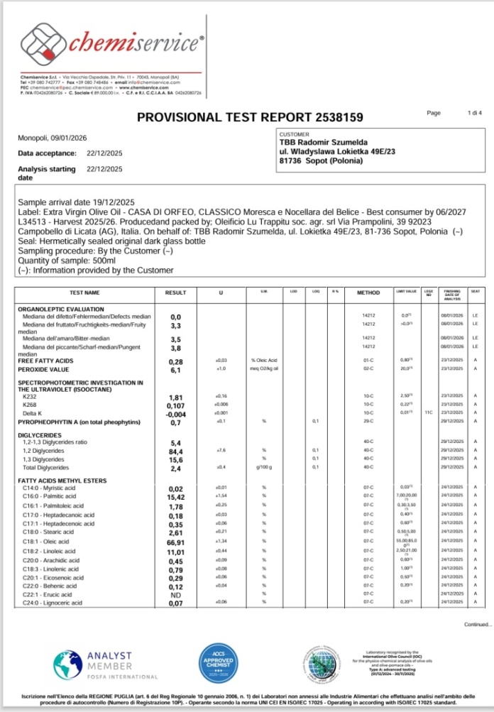 Ocena sensoryczna została wykonana przez oficjalnie uznany panel degustacyjny CIBI Bari