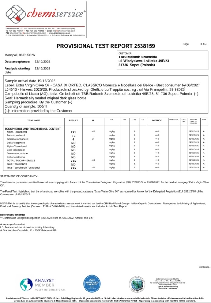 Raport z badań laboratoryjnych oliwy z oliwek extra virgin