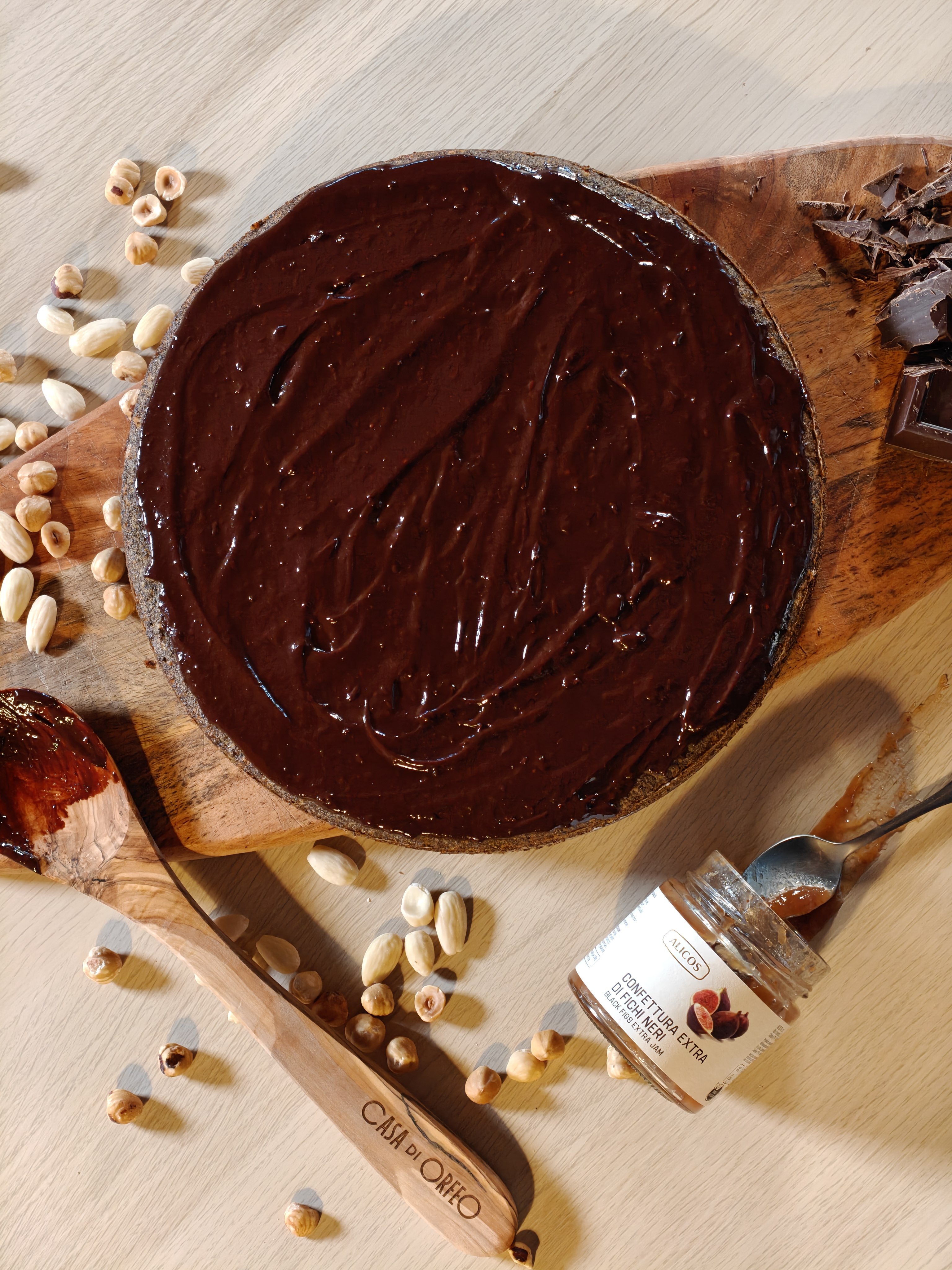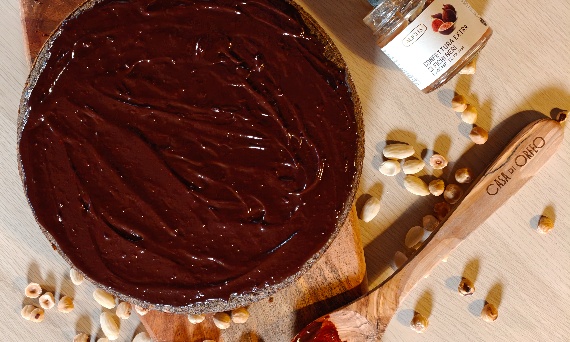 Podgrzej śmietankę, dodaj posiekaną czekoladę i konfiturę figową. Mieszaj do uzyskania gładkiej, błyszczącej polewy. Wylej ją na zimne ciasto i pozwól, by naturalnie spłynęła po wierzchu.